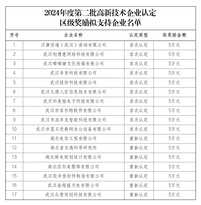 根据《市人民政府关于印发武汉市进一步加快创新发展若干政策措施的通知》(武政规〔2022〕5号)和《市科创局关于下达2024年度第二批高新技术企业认定补贴资金的通知》(武科〔2024〕79号)等文件精神,现对江汉区2024年度第二批高新技术企业认定拟兑现区级奖励的企业名单(详见附件)予以公示,公示截止时间为2024年10月29日。