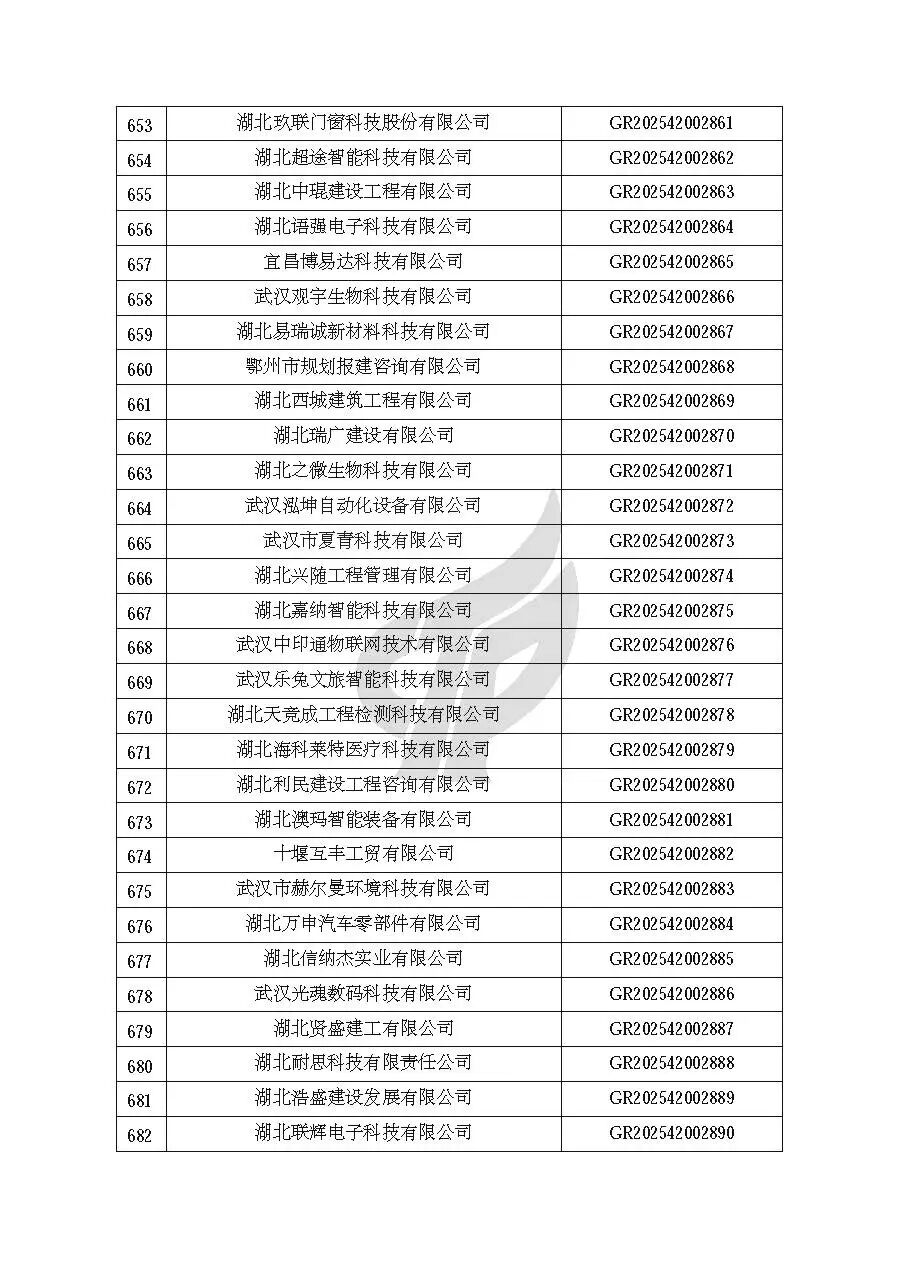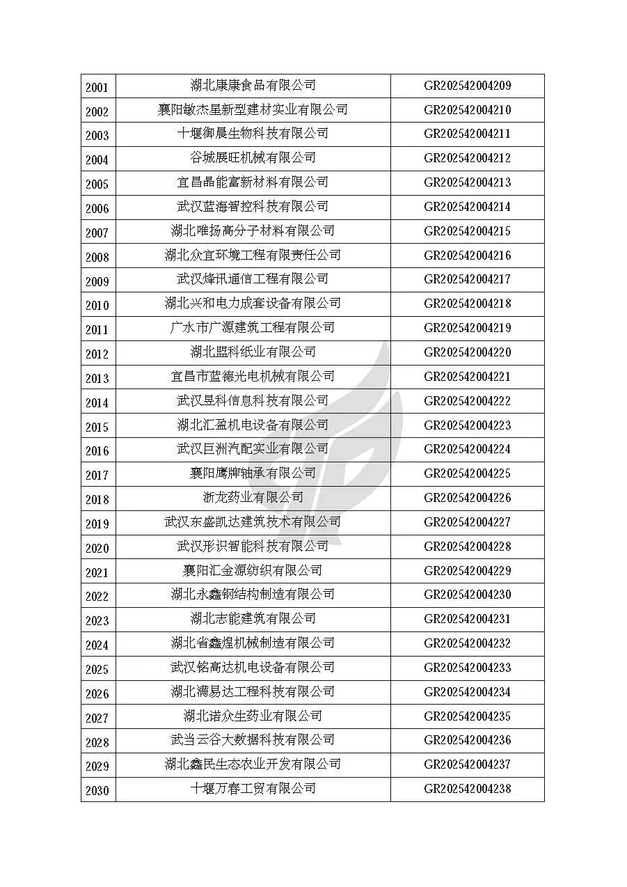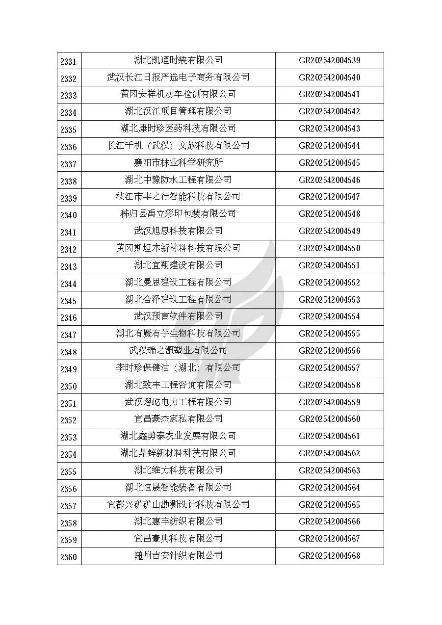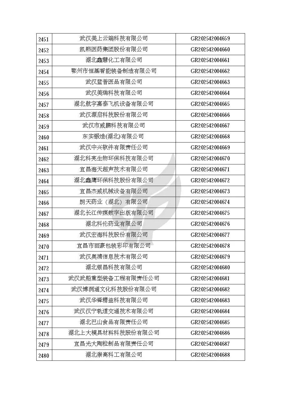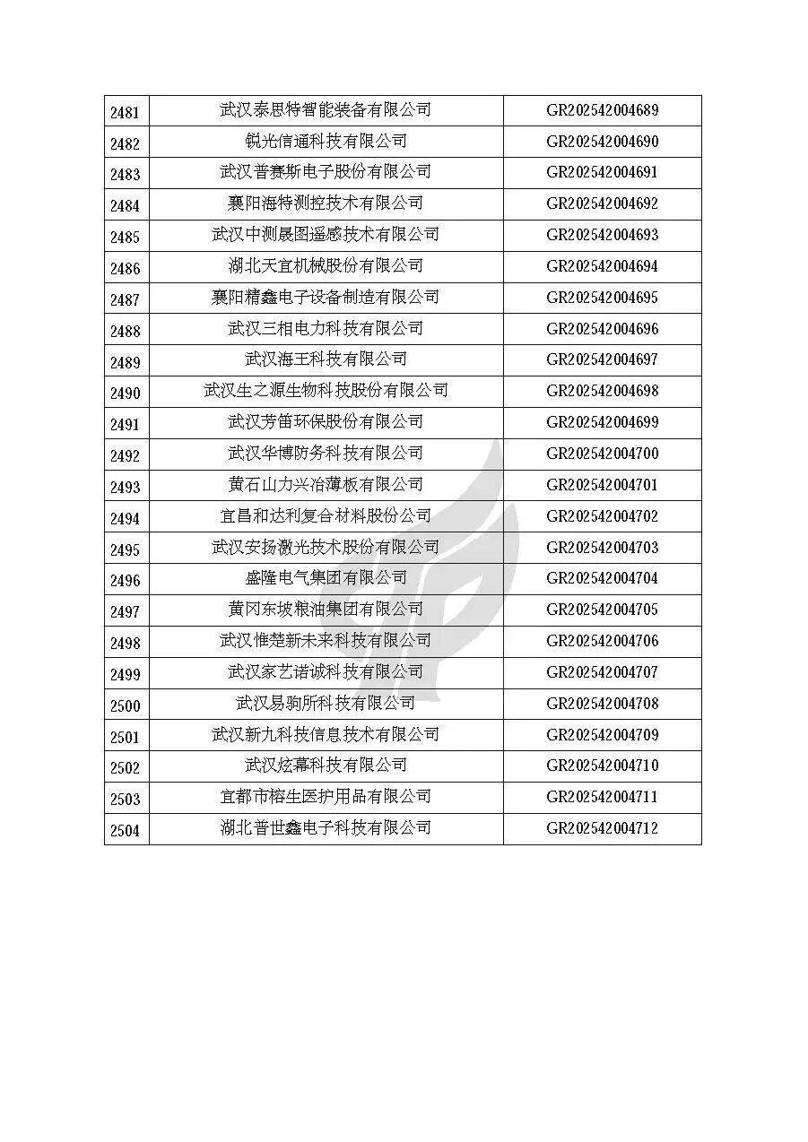 根据《高新技术企业认定管理办法》(国科发火〔2016〕32号)和《高新技术企业认定管理工作指引》(国科发火〔2016〕195号)有关规定,现对湖北省认定机构2025年认定报备的第三批2504家高新技术企业备案名单(详见附件)予以公告。
