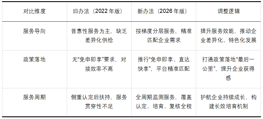 《新办法》共五章二十一条,配套三个附件,相较于旧版政策,在培育体系、认定标准、过程管理、培育服务四大维度实现突破性升级,构建起“范围更广、标准更严、管理更精、服务更准”的培育管理新格局,彰显了政策的系统性与前瞻性。
