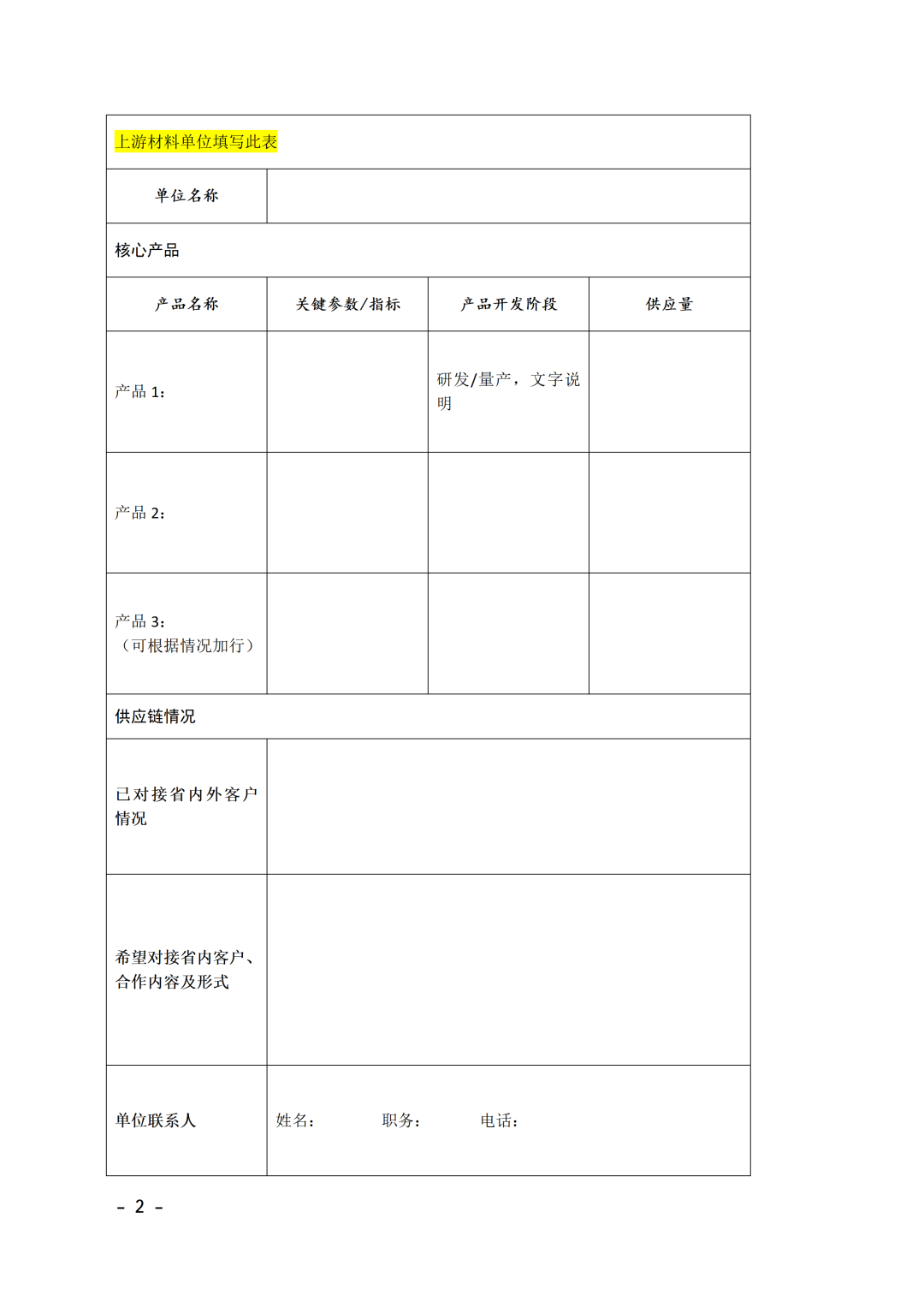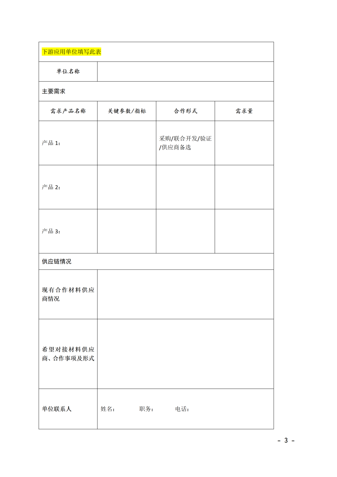 (二)下游应用企业(需求方)。请填报企业基本信息、企业生产、研发中所需材料、有意向联合研发的材料等。需明确:具体材料名称、基本性能指标、拟需求量,以及希望通过对接会解决的具体问题,如寻找二供、联合研发、测试验证等。