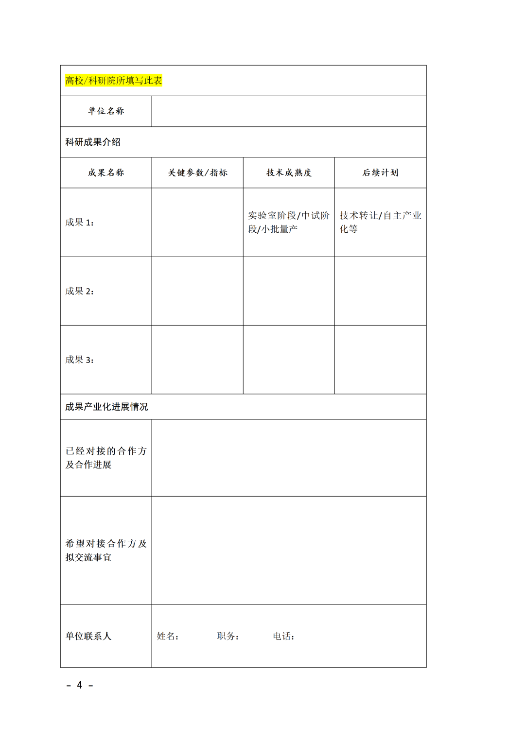 (三)高校及科研院所(成果方)。请填报单位基本信息,近三年内可转化的材料技术成果,或有明确产业化前景的专利技术。需明确:成果简介、应用场景、合作方式(技术转让/联合研发/成果作价入股等)、是否已有中试线或样品等。